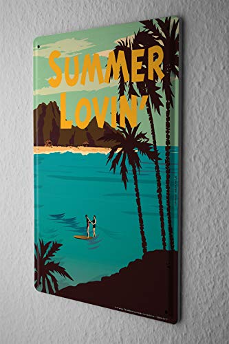 8x12" Nostalgic Tin Sign Wall Plate Surfing Couple Beach Palm Trees Summer Lovin Metal