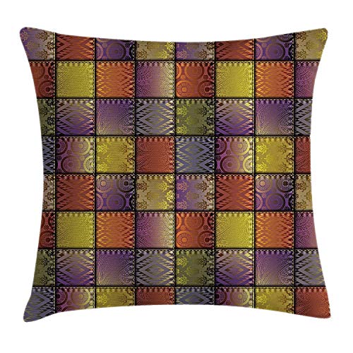 Fabric Throw Pillow Cushion Cover, Stitch-Like Digital Mix Motif with Inner Triangle Round Shapes Image, Decorative Square Accent Pillow Case, 18 X 18 Inches, Purple Gold and Cinnamon