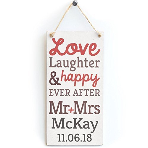 Saxton Funny Decorative Plaque Signs Love Laughter Happy Ever After Mr and Mrs Personalised Wood Hanging Sign for Home House Door