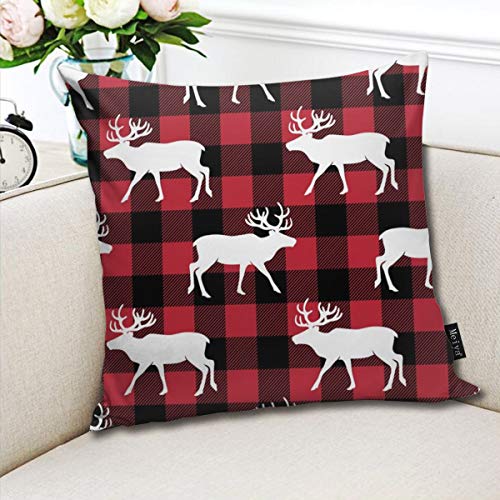 Reindeer On Buffalo Plaid Throw Pillow Covers Cushion Case Square Cushion Cover Pillowcase for Sofa Couch Bed Cotton for Home Decor 18 x 18 Inches