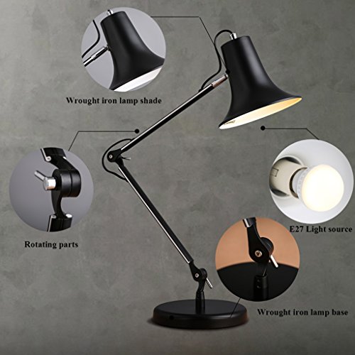 Wsxxn Long-arm Folding Black Wrought Iron Table Lamp Modern Minimalist Study Desk Reading Desk Lamp(E27)