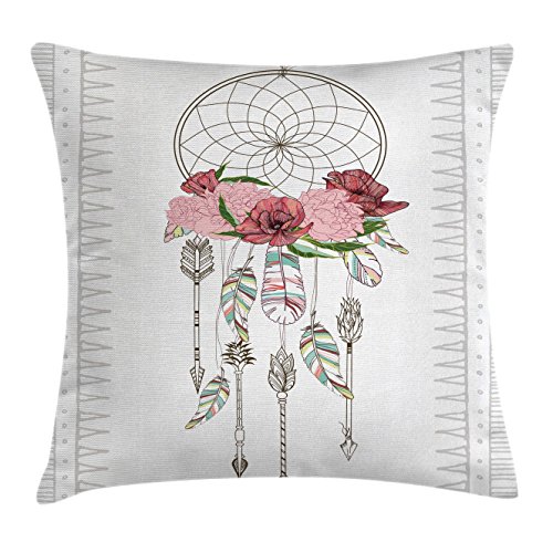 Ambesonne Bohemian Throw Pillow Cushion Cover by, Hand Drawn Illustration of a Dreamcatcher Boho Chic Design Ethnic Feathers Flowers, Decorative Square Accent Pillow Case, 16 X 16 Inches, Multicolor